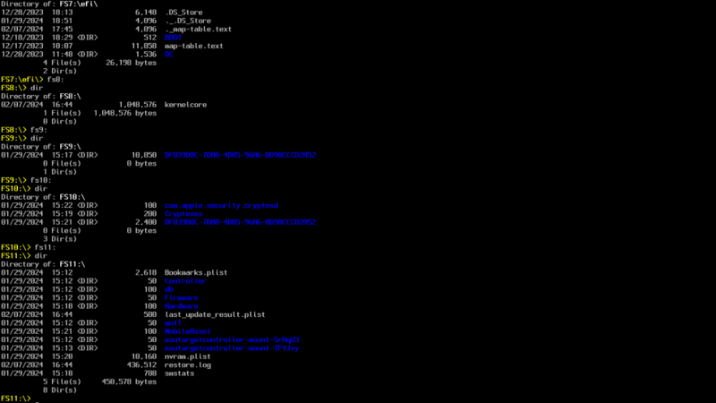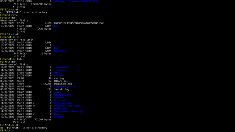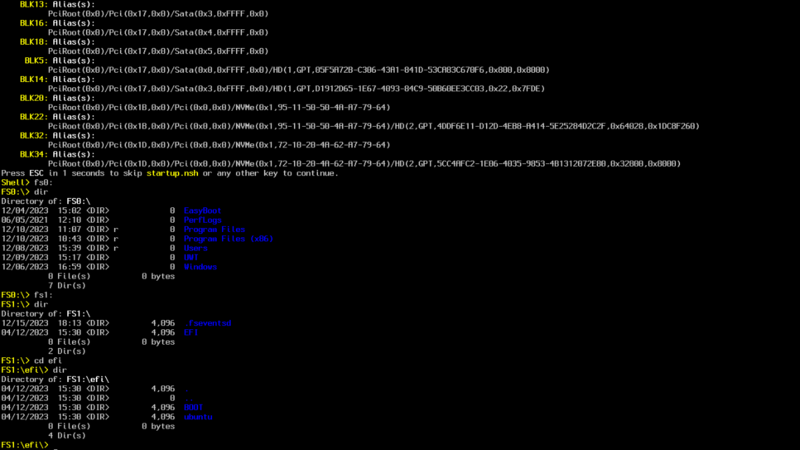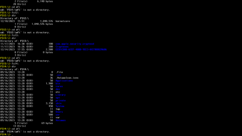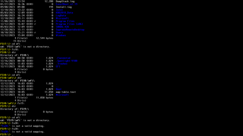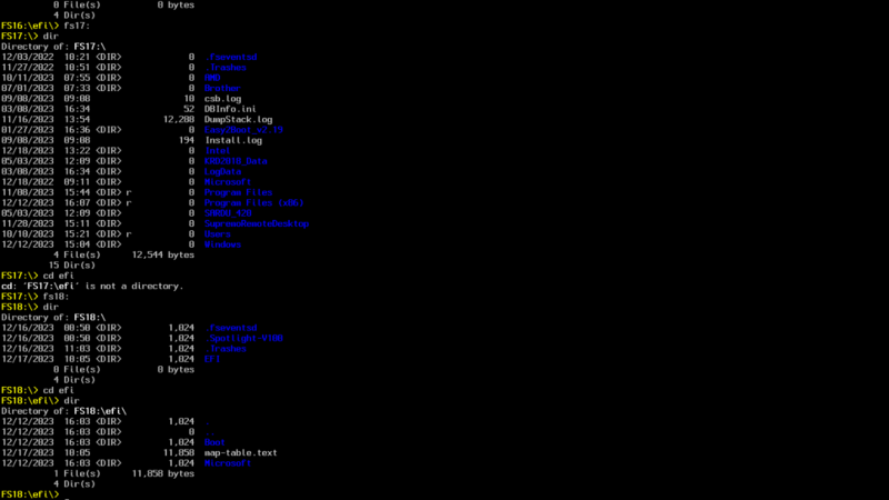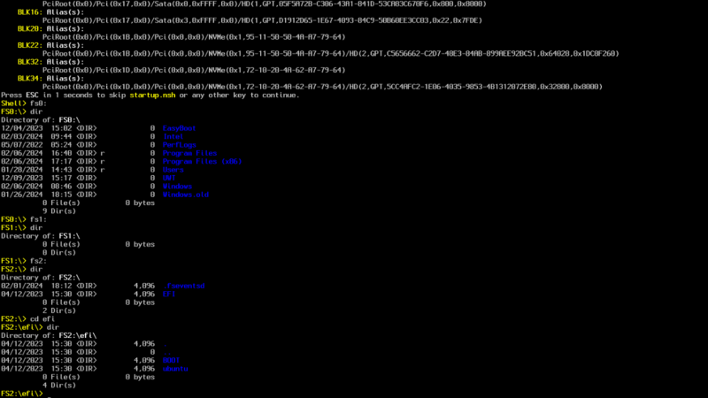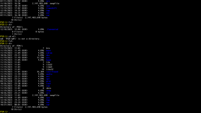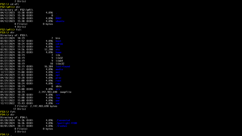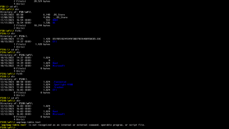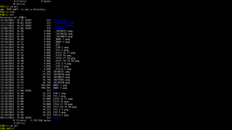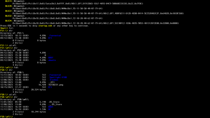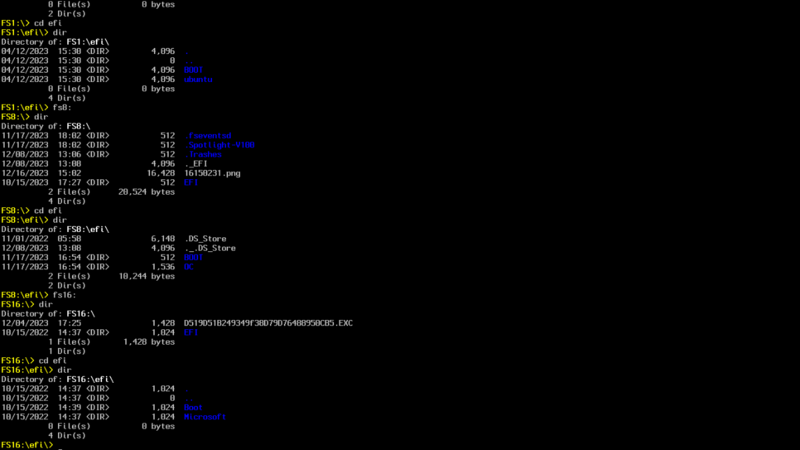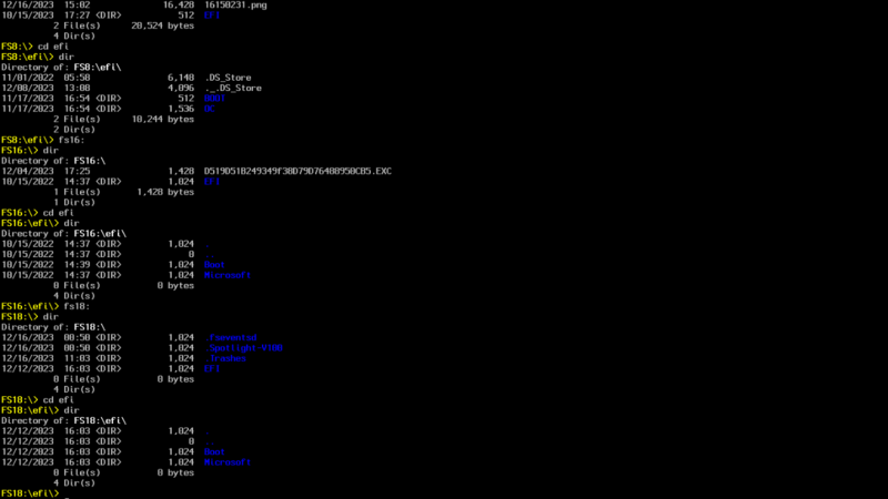 Ciao, per vedere al boot windows personale e prove ho disabilitato auxiliary, ho montato i dischi dove ci sono zorin e mint e in zorin non c'è efi mentre in mint si. Nel diskutil ci sono le efi delle distro linux.Ho copiato la cartella mint in efi sonoma.FS2,3,4......non ho trovato altri efi se non 1,8,16,18. Nella shell FS8 c'è qualcosa che non mi torna. Tra i file elencati trovo efi e ubuntu ma con cd efi+dir indica mac. Ti allego tante immagini. Al boot.1 attuale no name e efi non avviano nulla e si potrebbero nascondere i due windows e min e zorin avviano i sistemi.Al boot.2 mint non avvia nulla mentre i due windows si. Ho rinominato in entrie windows perchè avviavano il contrario. Avvio senza la usb. Poi guardo il plist che mi hai inviato e sistemo le icone.