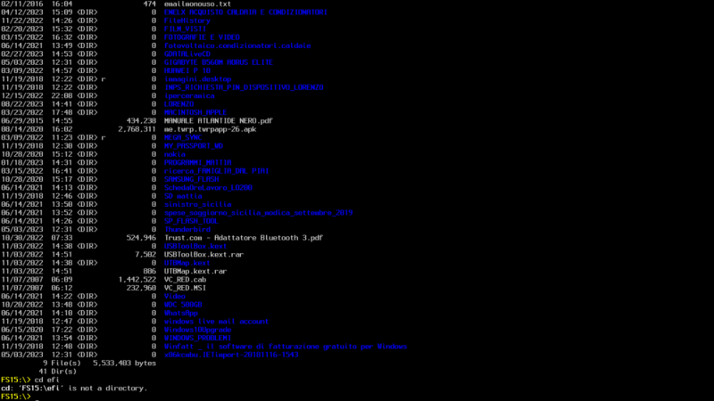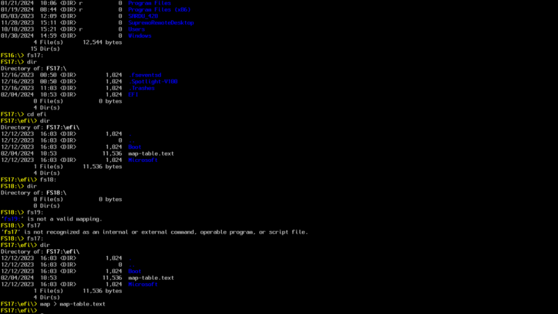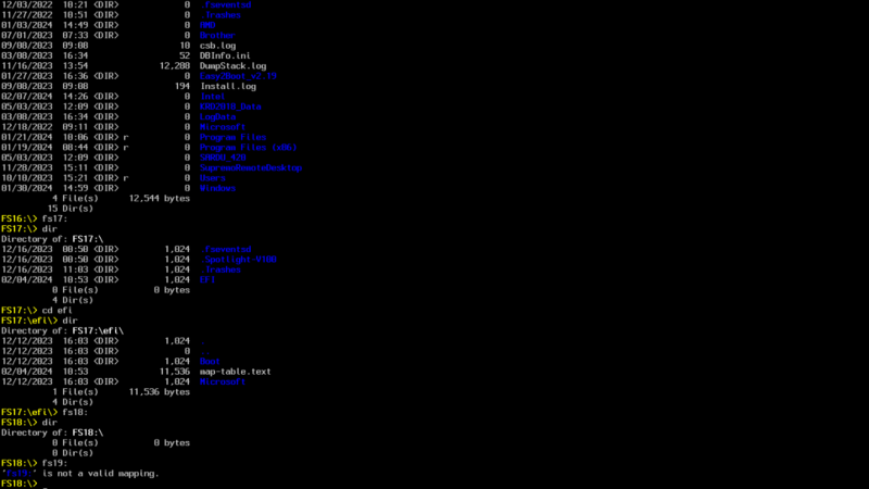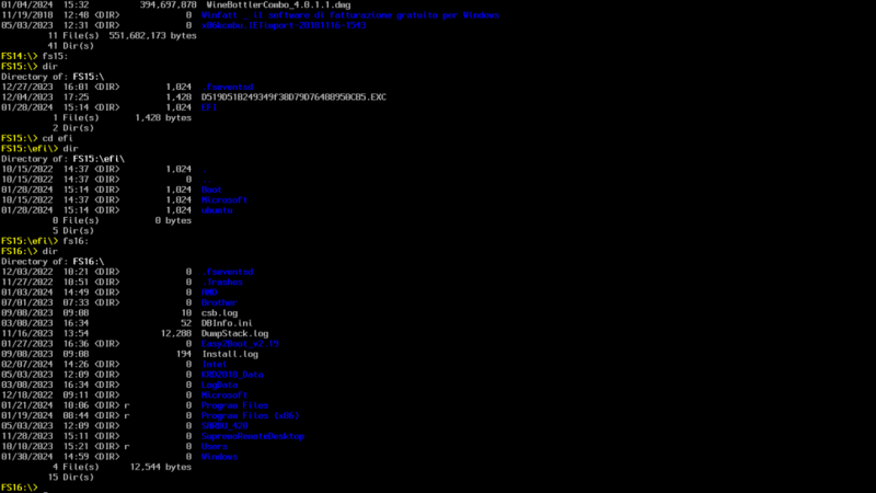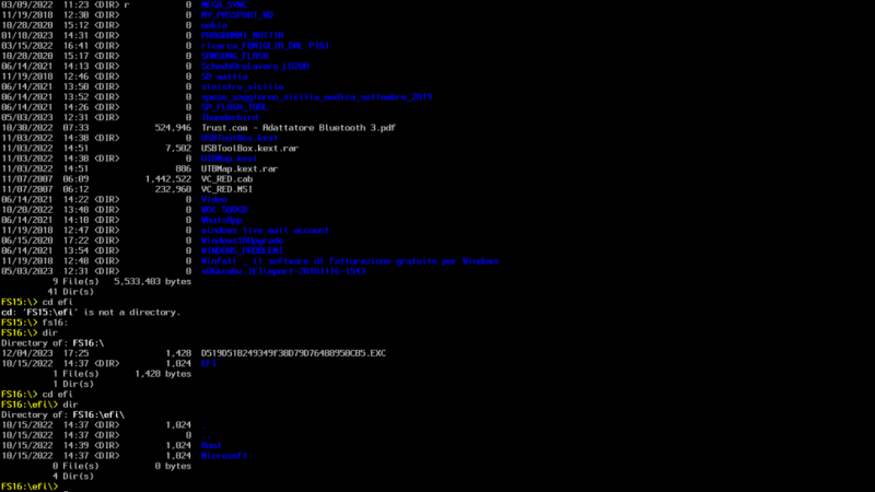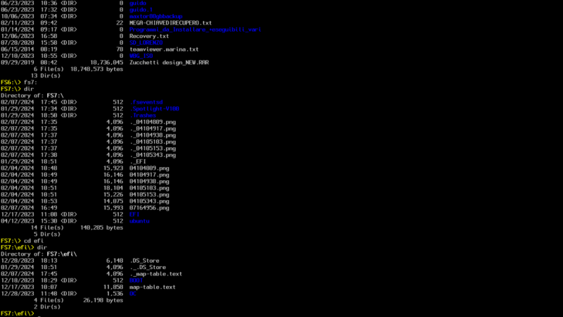 faccio mea culpa mi sono dimenticato il punto, devo stare più attento.Nel PC ho in dischi separati 2 sistemi windows uno chiamato personale l'altro prove,mint,zorin,sonoma. Allego nuove shell. FS1=Ubuntu"mint o zorin",FS8=sonoma,FS16=windows personale o prove,FS18=windows personale o prove non ho trovato l'altro EFI ubuntu"mint o zorin" sono arriva fino a FS30.Il file map non è stato generato con questo avviso: IT IS NOT RECOGNIZED AS AN INTERNAL OR EXTERNAL COMMAND, OPERABLE PROGRAM OR SCRIPT FILE", Allego diskutil. diskutil list.pdf.zip