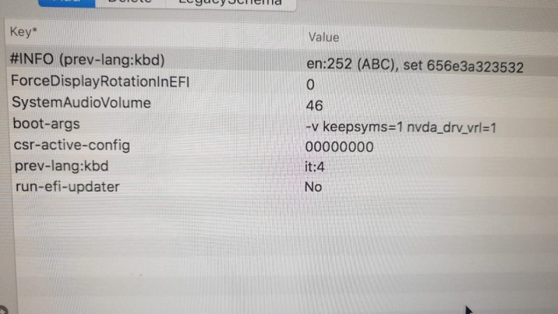 Ciao scusami ho montato la partizione efi nel hard disk e adesso il boot avviene da ssd, ho installato i driver nvidia e la grafica e'ok, ma mi manca audio, non mi funziona! Ti spiego, io ho collegato le casse con il jack alla motherboard, i miei codec ALC1220.hai soluzioni? Ti posto il log di gfxutil: Last login: Mon Oct 31 12:08:46 on ttys000 DESKTOP-Enrico:~ henry$ /Users/henry/Downloads/gfxutil-1.83b-RELEASE/gfxutil ; exit; 00:00.0 8086:3ec2 /PCI0@0/pci8086,3ec2@0 = PciRoot(0x0)/Pci(0x0,0x0) 00:01.0 8086:1901 /PCI0@0/PEG0@1 = PciRoot(0x0)/Pci(0x1,0x0) 00:14.0 8086:a2af /PCI0@0/XHC@14 = PciRoot(0x0)/Pci(0x14,0x0) 00:16.0 8086:a2ba /PCI0@0/IMEI@16 = PciRoot(0x0)/Pci(0x16,0x0) 00:17.0 8086:a282 /PCI0@0/SAT0@17 = PciRoot(0x0)/Pci(0x17,0x0) 01:00.0 10de:1b82 /PCI0@0/PEG0@1/GFX0@0 = PciRoot(0x0)/Pci(0x1,0x0)/Pci(0x0,0x0) 00:1b.0 8086:a2e7 /PCI0@0/RP17@1B = PciRoot(0x0)/Pci(0x1B,0x0) 01:00.1 10de:10f0 /PCI0@0/PEG0@1/HDAU@0,1 = PciRoot(0x0)/Pci(0x1,0x0)/Pci(0x0,0x1) 00:1c.0 8086:a290 /PCI0@0/RP01@1C = PciRoot(0x0)/Pci(0x1C,0x0) 00:1c.2 8086:a292 /PCI0@0/RP03@1C,2 = PciRoot(0x0)/Pci(0x1C,0x2) 00:1c.4 8086:a294 /PCI0@0/RP05@1C,4 = PciRoot(0x0)/Pci(0x1C,0x4) 00:1c.6 8086:a296 /PCI0@0/RP07@1C,6 = PciRoot(0x0)/Pci(0x1C,0x6) 00:1d.0 8086:a298 /PCI0@0/RP09@1D = PciRoot(0x0)/Pci(0x1D,0x0) 00:1f.0 8086:a2c9 /PCI0@0/LPCB@1F = PciRoot(0x0)/Pci(0x1F,0x0) 00:1f.2 8086:a2a1 /PCI0@0/PPMC@1F,2 = PciRoot(0x0)/Pci(0x1F,0x2) 00:1f.3 8086:a2f0 /PCI0@0/HDEF@1F,3 = PciRoot(0x0)/Pci(0x1F,0x3) 00:1f.4 8086:a2a3 /PCI0@0/SBUS@1F,4 = PciRoot(0x0)/Pci(0x1F,0x4) 00:1f.6 8086:15b8 /PCI0@0/GLAN@1F,6 = PciRoot(0x0)/Pci(0x1F,0x6) 05:00.0 1b21:2142 /PCI0@0/RP05@1C,4/PXSX@0 = PciRoot(0x0)/Pci(0x1C,0x4)/Pci(0x0,0x0) 04:00.0 10ec:b822 /PCI0@0/RP03@1C,2/PXSX@0 = PciRoot(0x0)/Pci(0x1C,0x2)/Pci(0x0,0x0) 06:00.0 1b21:2142 /PCI0@0/RP07@1C,6/PXSX@0 = PciRoot(0x0)/Pci(0x1C,0x6)/Pci(0x0,0x0) logout Saving session... ...copying shared history... ...saving history...truncating history files... ...completed. [Processo completato]