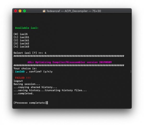 Mi da che fallisce con iAsl 6.3.. allego screen. Gli .aml di Origin sono nella cartella AML, poi eseguo lo script e non funzia... provo con una versione più vecchia UPDATE: con iasl 6.2 le decompila correttamente. Arrivano i file, ma il DSDT presenta errori PARSEOP_INTEGER se compilo... Archivio.zip