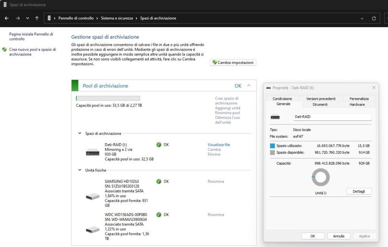 L'unico modo di creare un RAID 1 sotto WIndows e poi riformattarlo in EXFAT con dei tool tipo Aomei è con la funziona CREA POOL DI ARCHIVIAZIONE dal pannello di controllo (foto pool.jpg) Ma da OSX Ventura non viene visto..