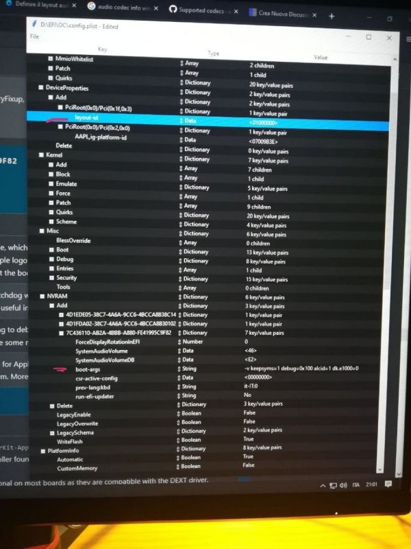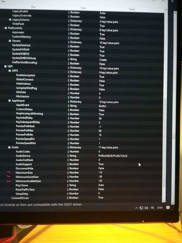 14. Ciao ragazzi , oggi dopo molto tempo ho iniziato questo nuovo hack che ha i seguenti componenti: CPU intel i5 11400 intel UHD 730 mobo msi z590 torpedo ram ddr4 16gb crucial ssd 240 Ho seguito la guida dortania e sono arrivato a compilare il config.plist mi sono fermato in due punti. -Nei boot-args lascio alcid=1 ? Il codec della mobo è ALC4080 ho controllato i vari codec e non trovo il corrispettivo layout -Mentre per quanto riguarda la seconda foto, nella guida c'è solo la voce "minimum volume" e nel mio config ci sono 3 voci diverse . PS: Ho sbagliato sezione , me ne sono accorto dopo 😒
