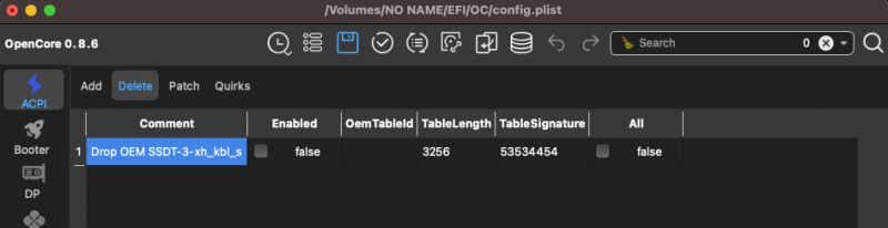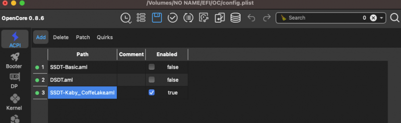 6. Ok, quindi ricapitolando: disabilito drop e abilito SSDT-BASIC assieme al KABY_COFFEELAKE? Non so come mai, ma con la EFI OC che mi hai postato, dopo tipo 20 secondi in Ventura, si riavvia il pc. Me l'ha fatto anche la prima volta che ho provato a bootare con OC, prima delle modifiche agli SSDT.