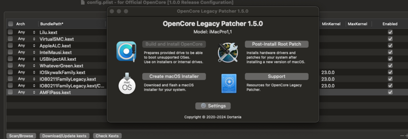 ok sposto in ultima posizione. ho la versione 1.4.0 di AMFIpass installo l'ultima versione e tolgo -amfipassbeta ? si si OpenCore-Patcher.app è installato ho la versione 1.5.0