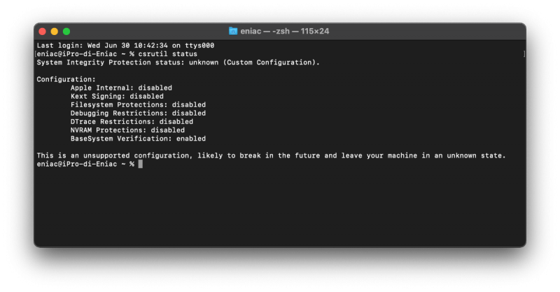 24. Mi accorgo adesso che SIP è disattivato , almeno credo , HackCheck dice che è disattivato , Powertool dice che è attivo ed il terminale dice che la configurazione non è supportata