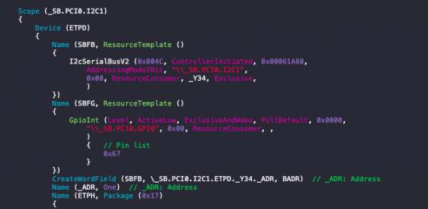 Caro @Gengik84[/mention] ho provato ad effettuare il GPIO pinning sul DSDT di @Emanuele-1998[/mention] senza alcun successo. Ho seguito questa guida: https://voodooi2c.github.io/#GPIO%20Pinning/GPIO%20Pinning">https://voodooi2c.github.io/#GPIO%20Pin ... %20Pinning">https://voodooi2c.github.io/#GPIO%20Pinning/GPIO%20Pinning Ti posso dire per certo che il dispositivo ha come "Nome dispositivo BIOS" \_SB.PCI0.I2C1.ETPD . Ho cercato sul suo IOReg ETPD e ho trovato che sta sotto il seguente path: IOService:/AppleACPIPlatformExpert/PCI0@0/AppleACPIPCI/I2C1@15,1/VoodooI2CPCIController/VoodooI2CControllerNub/VoodooI2CControllerDriver/ETPD Lo IOReg è stato effettuato con VoodooI2C e VoodooI2CELAN installati sotto EFI/CLOVER/kexts/Other Aperto il suo DSDT ho cercato ETPD e l'ho trovato alla riga 61917 A questo punto, sempre dallo IOReg ho cercato IOInterruptSpecifiers e l'ho trovato sotto il path "IOService:/AppleACPIPlatformExpert/PCI0@0/AppleACPIPCI/I2C1@15,1" ed ha come "data" . Quindi ho assunto 0x11 come pin APIC e risulta minore di 0x2F (33 Arrivato a questo punto ho rimosso SBFI (dato che conteneva un Interrupt) e ho dedotto che il dispositivo, secondo la guida linkata, è well-root pinned (dato che il metodo _CRS contiene "Return (ConcatenateResTemplate (SBFB, SBFG))" ). Cosa potrebbe essere? Ciao e grazie