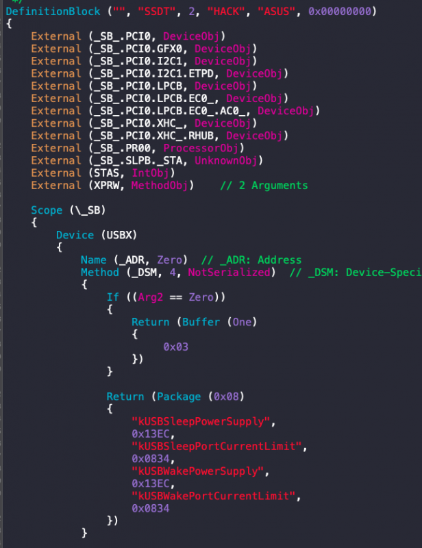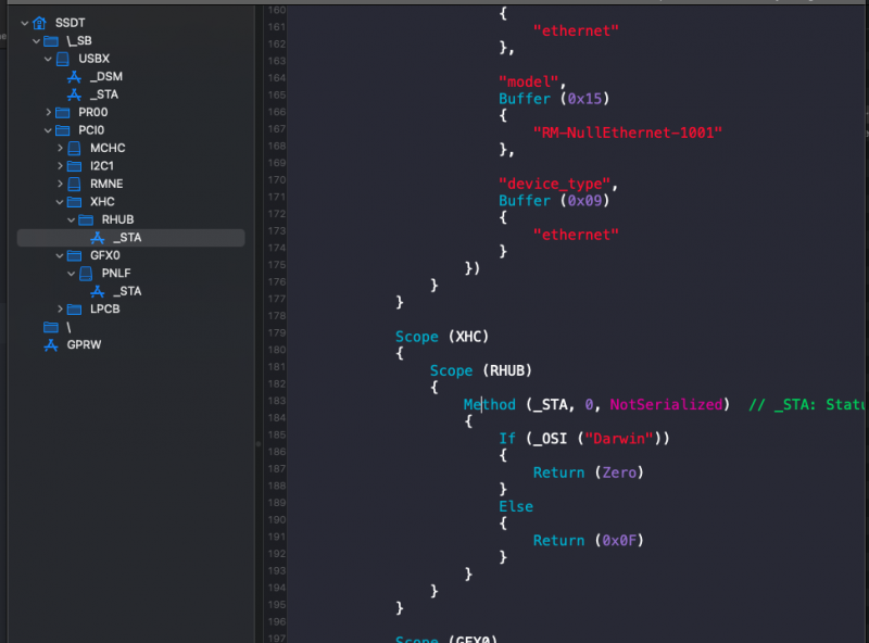 Stai fornendo delle EFI prefatte senza conoscere lo stato del firmware del portatile: - l'utente non ha fornito un SysReport - Non ha fornito un log ACPI - Non ha fornito in che stato sta il DVMT dati anche i problemi di grafica Sulla tabella ACPI che hai girato, ho un paio di osservazioni da fare: RHUB non serve ad una mazza, ed è contro le ACPI spec Poi hai messo: ti faccio notare che ci sono dei valori irrilevanti per i portatili, che riguardano kUSBSleepPowerSupply, USBX nei laptop è così Non sai se dentro ci sta EC0 o H_EC e in che specifico percorso, stesso per PR00 anche se dopo skylake diciamo che sono tutti PR Hai messo rename GPRW quando ancora non ha detto di avere problemi di sleep Hai presupposto che abbia MAT = 1, ma prima si vede il log di opencore Le proprietà specificate servono solo se richieste, come force-online se e solo se display interni o collegati via HDMI hanno problemi dopo il wake dallo sleep dvmt-calc-fix hai messo su 1, ma non hai controllato se può mettere un multiplo di 32 (possibilmente 64MB) o meno sul BIOS Perché presupposto che ci siano problemi di TSC? Ma poi soprattutto, perché ancora metti questo kext che è peggio del cancro? Ha detto di avere necessità di usare la WiFi intel? Se avesse piani per mettere qualcosa tipo broadcom? Se metti AirportItlwm serve abilitare il secureboot tra l'altro.... E ancora a patchare a tutta birra Perché dovrebbe avere problemi di USB Ownership? Da dove l'hai capito? Detto ciò... EFI prefatte su basi nulle... Bah