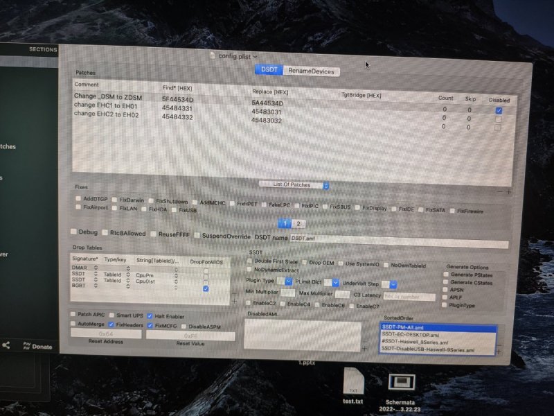 Salve a tutti, Oggi ho finalmente iniziato a smanettare con OpenCore e devo dire che mi piace molto perchè inizio a capire “cosa fa cosa”. Ho montato la EFI a mano e configurato il config anche se non completamente. Mi mancano solamente le parti ACPI e PlatformInfo. Premetto che attualmente sto utilizzando Clover con un DSDT che mi è stato settato da @Gengik84 - per ACPI, add, item 0 devo estrarre il DSDT vanilla (con F4 alla schermata di clover) e metterlo nella cartella ACPI? - sempre per la parte ACPI, patch, item 0 ecc, dove trovo le patch da applicare? sto dando un occhiata al config di clover per avere un idea però vorrei che mi confermiate dove trovare esattamente le patch che ho attualmente applicate nel config di clover. - la parte relativa al PlatformInfo la lascio per ultima perché credo di capire che bisogna solamente prendere i dati smbios ecc dal config di clover. Allego foto della cartella EFI ed il config OC. Per favore che qualcuno ci dia un'occhiata. I dettagli del mio sistema sono in firma. Grazie config.plist.zip