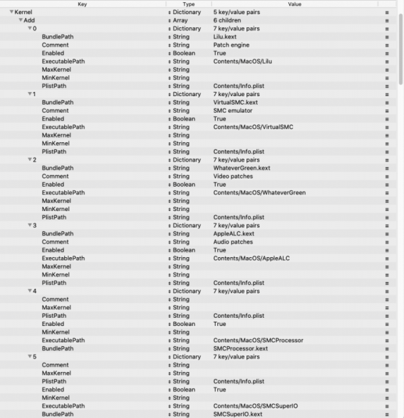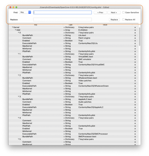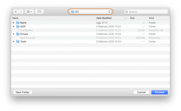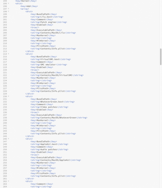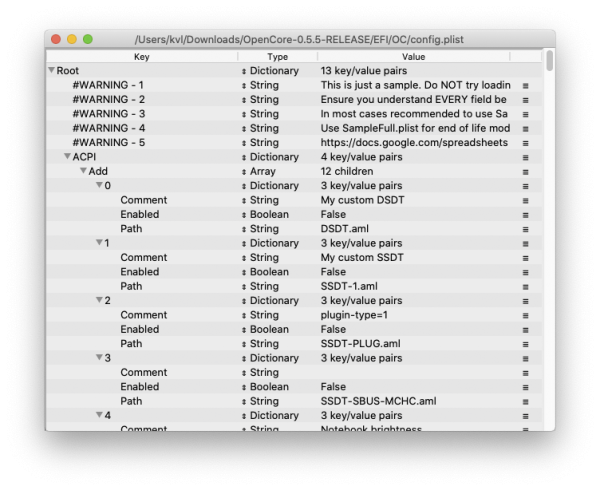 Buonasera a tutti! Come suggerito da @iCanaro, pubblico qui una mini guida per segnalare e spiegare (ci provo!) l'utilità questo software. Per chi ha come me basi solide di informatica ma è alle prime armi nel mondo Hackintosh, questo editor può tornare molto utile. Quello che ho apprezzato è che permette di visualizzare e collassare le varie sezioni del file di configurazione in modo piuttosto intuitivo, nel dettaglio io l'ho usato per configurare il config.plist di OpenCore. Pagina da cui effettuare il download: https://github.com/corpnewt/ProperTree scegliere "Clone or download" e poi "Download ZIP". Una volta scaricato e scompattato, troveremo i seguenti file: Quello che a noi interessa è "ProperTree.command", che permette di avviare il programma. Avviamolo (tasto dx / CTRL+Click -> Apri e poi nuovamente "Apri") e questa sarà la finestra che otterremo: Il menù "File" è semplice, le opzioni sono poche, a noi interessa aprire il file config.plist (nell'esempio Sample.plist di OpenCore 0.5.5 rinominato config.plist) Interessanti sono le funzioni "OC Snapshot", "Convert Window" e "Toggle Find/Replace" si cui torneremo dopo. Aprendo il config.plist si presenta così: Non entreremo naturalmente nel merito di come si configura il file config.plist, ma solo delle funzioni del programma. Esattamente come nel Finder, è possibile usare le freccette a lato delle sezioni per visualizzare tutti i livelli o nasconderli. Questo risulta molto utile per seguire la guida che si muove attraverso le sezioni esattamente in questo ordine. Passando alla funzione "OC Snapshot", questa è la cartella con i Kext: Usando la funzione si apre questa finestra, è importante posizionarsi nella cartella OC dentro la cartella EFI: Proseguamo con "Choose" ed ecco che nel config.plist sono stati inseriti automaticamente i file Kext presenti nella cartella. E sono anche nell'ordine giusto! Lo stesso vale per i file dentro la cartella ACPI, Drivers, Tools. Se abbiamo la necessità di convertire un valore da esadecimale a numerico o testo e viceversa, il programma è dotato di un utile convertitore: Ultima ma non per importanza, la finestra di ricerca, utilissima per trovare una chiave di cui ci ricordiamo il nome ma non dove si trova oppure una valore ma non la chiave dove è inserito: Menzione d'onore al copia-incolla (tasto dx / CTRL+Click, fondamentale per portarsi dietro durante i test intere sezioni (nodi XML) da un file all'altro. Per farvi capire la differenza, un file .plist aperto in modalità testo è così, ProperTree ci viene in aiuto anche solo per semplificarne la lettura: Vale la pena di notare che ProperTree funziona anche sotto Windows, basta aprire "ProperTree.bat" a patto di avere le librerie Python installate. K.