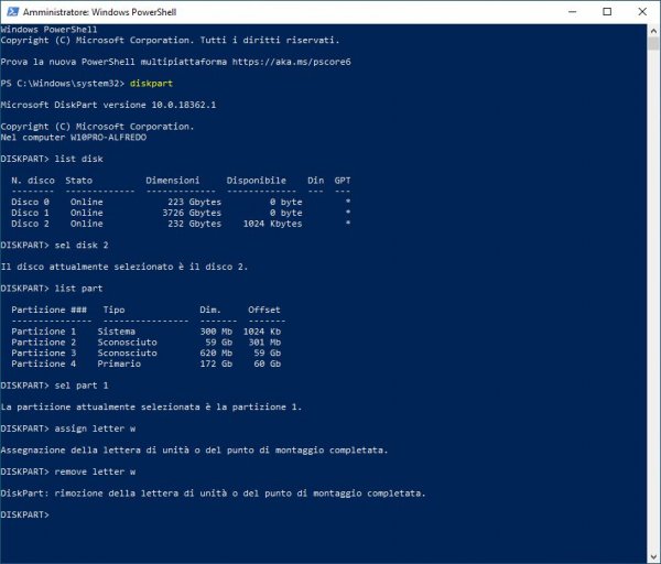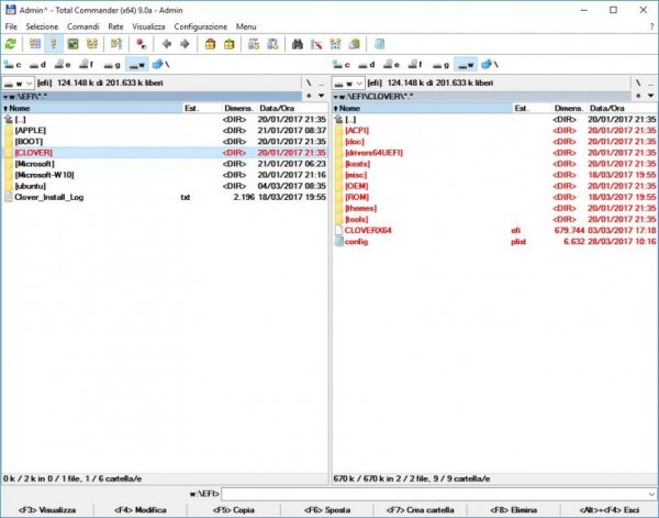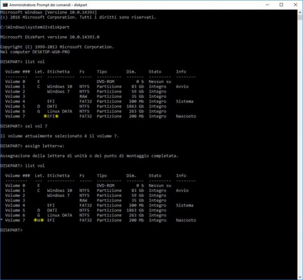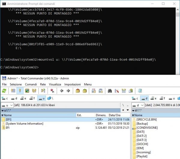 Se abbiamo necessità di modificare la EFI possiamo accedervi anche da Windows. Dall'angolo in basso a sinistra, con il tasto destro, aprire un Prompt come amministratore: Oppure PowerShell: Digitare "diskpart" (digitare i comandi senza le virgolette) Visualizzare i Volumi con "list vol" Identifichiamo il Volume della EFI che vogliamo montare (esempio Volume 7) Selezioniamo il volume con "sel vol 7" Assegniamo una lettera alla nostra EFI con "assign letter=w:" Digitiamo "list vol" per vedere se tutto è andato a buon fine: Ora possiamo accedere alla nostra EFI Se la EFI è quella di sistema (multiboot stesso disco) possiamo semplificare tutto con un solo comando: "mountvol W: /s" In entrambi i casi (per la EFI di Sistema) abbiamo bisogno di aprire un esplora file come amministratore Esempio Total Commander: Se abbiamo più Dischi collegati possiamo usare i Comandi con maggiore Flessibilità: Diskpart list disk Per vedere i Dischi collegati sel disk 2 Selezioniamo il Disco su cui vogliamo operare list part Per vedere in ordine le partizioni solo del Disco Selezionato sel part 1 Selezioniamo la Partizione che ci interessa assign letter w Assegniamo una lettera alla Partizione per operare da Windows remove letter w Rimuoviamo la Partizione, se non vogliamo più visualizzarla nelle Device Risposta sul Terminale: - ------------------------------------------------------------------------------------------------------------------------------------- Montaggio EFI della USB Per montare la EFI della USB usiamo il comando “mountvol” mountvol /? (Guida e GUID dei Volumi) Identifichiamo il nostro Volume: - - Montiamolo su una Device libera, ad esempio U: - mountvol u: \\?\Volume{4feca7a9-070d-11ea-9ce4-0019d2ff84e0}\ EFI editabile con un File Manager come Amministratore: - - mountvol u: /d se vogliamo smontarla, altrimenti rimarrà assegnata. Un'altra soluzione per l’assegnazione è quella di usare un Programma come Paragon o BOOTICE: - -