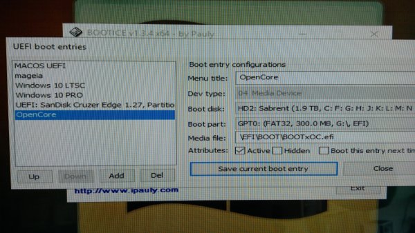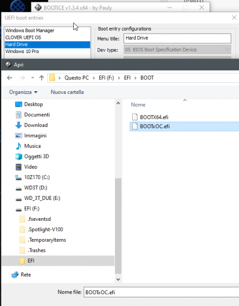 Premesso che quello che vado spiegare, può essere perseguito in diversi modi, per chi è avvezzo all'uso della shell di Clover o di OpenCore potrebbe essere un gioco da ragazzi ottenere ciò; ma per chi non è uso ai terminali si ottengono buoni risultati servendoci di semplici, ma molto potenti, applicazioni con interfaccia grafica. Quale è lo scopo di questa mini guida, è quello di invogliare i più pigri ad iniziare usare OpenCore contemporaneamente a Clover, sulla EFI del disco e senza che i bootloader si pestino i piedi tra loro. Quindi si continua con il normale uso/utilizzo di Clover e poi se riesce nello scopo, tramite la scelta del tasto funzione (F8, F11 etc..) nella fase di post del BIOS sarà possibile avviare direttamente OpenCore. Una vantaggio molto evidente, è quello che se si hanno 2 bootloader funzionanti e indipendenti per il proprio hack, nel caso di esperimenti, nuovi kext che causano blocchi o kernel panic, macOS è comodamente avviabile dall'altro bootloader (sempre che i kext siano in EFI e non installati in L/E oppure in S/L/E) L'app principe per eseguire ciò è BOOTICE software standalone molto potente quindi maneggiare con attenzione ed evitare di cancellare partizioni, dischi etc... non mi assumo responsabilità se pasticciate a caso. Personalmente BOOTICE lo uso con windowsPE by Strelec, ma nessuno vieta di inserirlo in qualsiasi altra LivePE, come pure se siete in multiboot diusarlo direttamente da Windows. Come un attento utente di hack, sa che il file che avvia Clover è allocato nella partizione di avvio EFI (FAT32 flag boot+esp) in cui all'interno si ha una cartella EFI (nota di colore, qualche anno fa, con tutte queste EFI, ci uscivo matto ) quindi: EFI/ BOOT/BOOTX64.efi il file di avvio ha la medesima allocazione e nome EFI/ BOOT/BOOTX64.efi quindi che ho fatto, l'ho rinominato in BOOTxOC.efi e l'ho affiancato a BOOTX64.efi di Clover EFI/ BOOT/BOOTX64.efi EFI/ BOOT/BOOTxOC.efi EFI_BOOTSchermata 2019-08-24 alle 21.59.59.png tutto questo da macOS naturalmente, ma è fattibile anche da Windows. Poi il prossimo passo è quello di usare BOOTICE ed aggiungere alle entries del BIOS quella del bootloader di OC BOOTICE_01_CHaZNa1elC.png avviato il software si seleziona il TAB UEFI e poi si clicca su Edit boot entries e si va ad aggiungere la entries di OpenCore browsando sino al bootloader. NB: da windows come da macOS la partizione EFI è di sistema e nascosta; mentre su macOS esistono diversi tool o un semplice comando da terminale è possibile montarla, su windows questo è un pelo più complicato, ma di facile soluzione. Tra le varie opzioni esiste un software che anche nella sua versione freeware permette di montare facilmente la EFI, si tratta di Mini Tool Partition Wizard Free: una volta scaricato e installato (attenzione a NON installare altre cose durante il setup) si avvia e dalla sezione gestione partizioni/disci si individua la EFI, le si assegna una lettera e si applicano le operazioni. Fatto questo poi sarà browsabile da BOOTICE. PS: 06-08-2020 Al tempo in cui scrissi questa miniguida, non notai che è possibile montare/smontare molto facilmente la EFI, anche con BOOTICE con il tab Physical disk --> parts manage NB: alla fine delle operazioni, ricordarsi sempre di togliere la lettera assegnata alla EFI ADD_BOOTxOCa5x1XNV16f.png OpenCore_Entries_7tmGF4u5s2.png BOOTICE_IMG_20190824_170827.jpg Poi come nel mio caso, se si hanno diversi OS e magari entries fantasma, se ne può approfittare per fare pulizia ed assegnare nomi alle entries facilmente identificabili; quindi si salva e si esce. Poi quando si riavvierà il sistema, spingenfo l'apposito tasto funzione che permette la scelta con cui avviare, ci troveremo tra le varie voci la possibilità di avviare direttamente OpenCore Z170_hack 4 in firma Z170_ENTRIES_IMG_20190824_225327.jpg Z170_OC_BOOT_IMG_20190824_225430.jpg Z370 --> hack 2 in firma BOOT_OPTIONS_IMG_20190824_171158.jpg Una volta avviato OpenCore poi si sceglie quale macOS avviare se se ne ha più di uno, oppure si avvia il solo che si ha. OpenCore_la_scelta.png Bene direi che abbiamo terminato, spero sia tutto chiaro e abbia invogliato qualche lettore ad applicarsi per avere tra le proprie frecce al suo arco anche l'opzione di impegnarsi per avviare il proprio hack anche con un boot loader diverso... e ricordo che esiste la guida/tutorial ATTENZIONE tutto questo testato e verificato il funzionamento su sistemi recenti da skylake/Z170 in poi in UEFI puro. In sistemi legacy NON è stato testato.