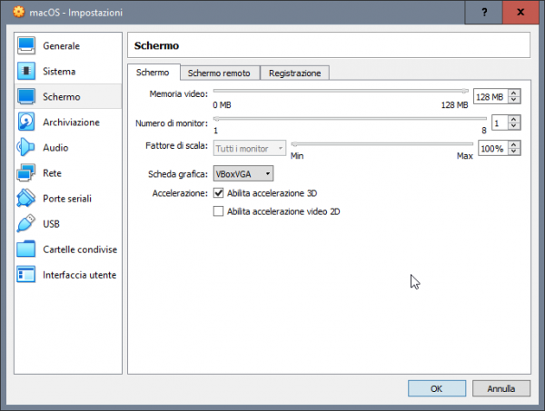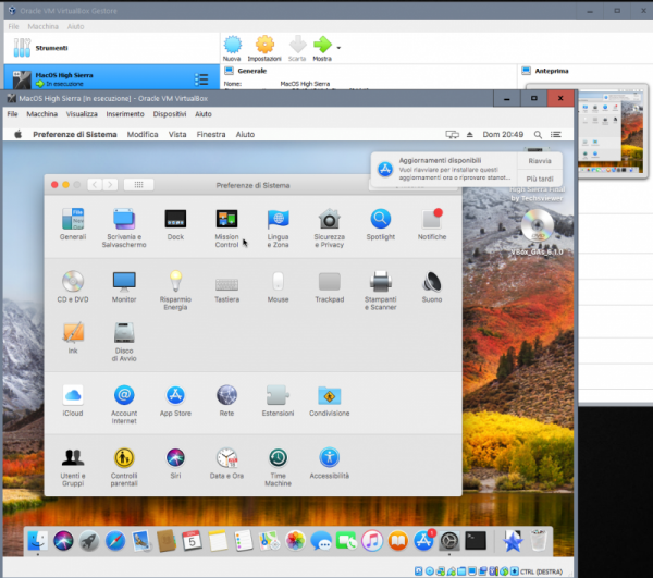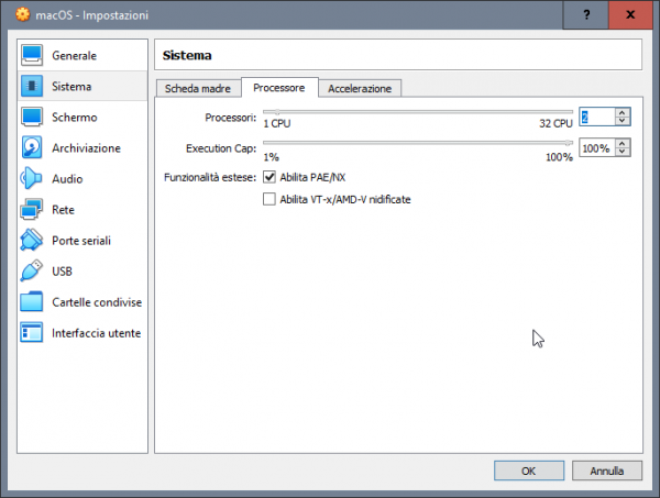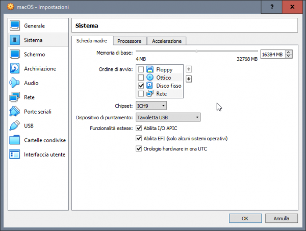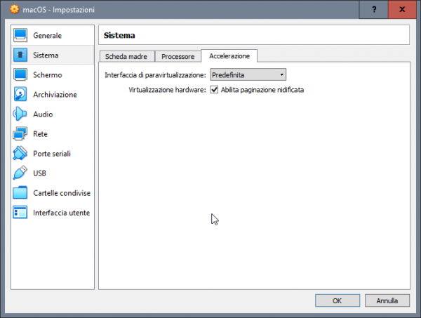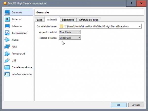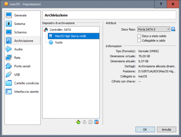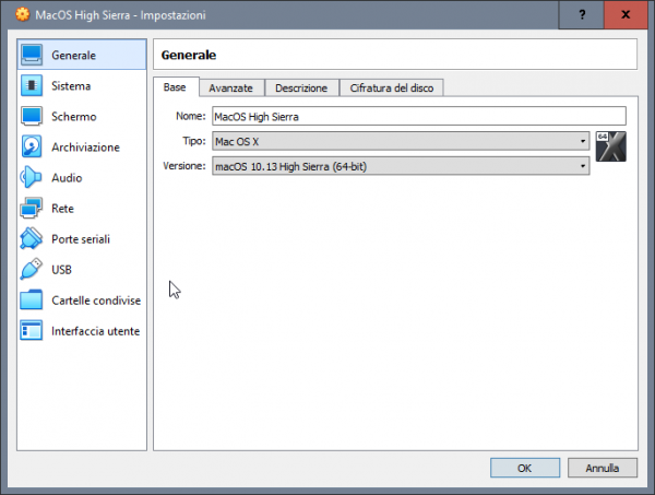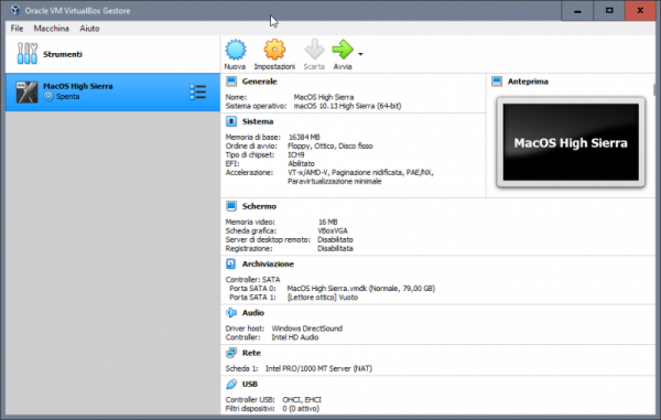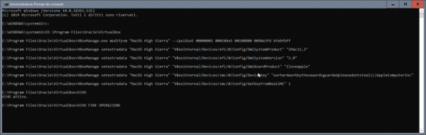 Tentativo di far qualcosa di intellegibile per aiutare chi si vuole approcciare a macOS avendo solo windows. Generalmente a chi piace testare sistemi operativi, e dopo aver provato i vari windows, linux poi rimane ben poco... sovviene alla mente che ogni tanto si sente parlare di hackintosh, un mondo di nicchia e molto particolare, ovvero far funzionare al meglio macOS su hardware windows. Spesso la parte più difficile è appunto la partenza per chi ha il solo windows, chi ha almeno un vero mac o un'hackintos il tutto risulta più agevole, ovvero la creazione della pendrive con il metodo vanilla e un'installer ufficiale scaricato da app store. In mancanza di mac e hack si deve necessariamente fare affidamento ad una macchina virtuale, per cui in questa guida si cercherà di aiutarvi per tentare il primo approccio al mondo hack. Esiste già un modo per riuscire a creare direttamente la pendrive per avviare in recovery di macOS e poi da li scaricare l'installer completo >> Boot Disk Utility: recupero/installazione macOS da Windows a volte però non vengono caricati i kext della LAN quindi si è isolati per cui risulta inutile e si deve per forza avvalesi di una VM Il primo passo è ottenere Oracle VirtualBox https://www.virtualbox.org/wiki/Downloads si scarica l'ultima release e il VM VirtualBox Extension Pack ovviamente si procede all'installazione prima di VirtualBox (VB) e poi terminata si clicca destro mouse sull'extension pack --> apri con e si seleziona virtualbox Il secondo passo è ottenere un macOS in vmdk --> vedi qui Quale versione di macOS in vmdk ottenere, dipende dalla tipologia di hardware in cui poi si vuole installarlo realmente, io consiglio High Sierra 01-04-2020 Una volta terminata l'installazione si avvia VB e si procede alla creazione della macchina virtuale. si clicca su nuova inseriamo il nome del nostro OS virtuale, in questo caso macOS High Sierra si imposta la dimensione della RAM che può usare, generalmente meglio non andare oltre alla metà di quella disponibile sul PC si seleziona: usa un file di disco fisso virtuale e si clicca sulla cartella poi si clicca su aggiungi e si seleziona il macOS.vmdk si seleziona e si clicca scegli e si ottiene come da screenshot qui sotto poi si clicca crea ed otterremo la VM spenta quindi si passa a impostazioni della VM selezionata generale --> base generale --> avanzate in sistema --> scheda madre, in ordine di avvio deselezionare floppy e letore ottico nel caso non lo si avesse fatto prima, si può regolare la dimesione della RAM da assegnare alla VM in sistema --> processore settare 2 CPU in sistema --> accelerazione normalmente non occorre cambiare niente in schermo --> schermo si abilita accelerazione 3D e si imposta 128Mb di VRAM per memoria video in schermo remoto e registrazione non occorre toccare niente in archiviazione --> dispositivi archiviazione si seleziona il macOS virtuale in audio --> audio la mia scelta è di disabilitarlo in rete --> scheda 1 > abilita scheda di rete connessa a NAT porte seriali disabilitate USB --> abilita controller USB 2.0 oppure anche 3.0 in cartelle condivise e interfaccia utente per il momento non occorre settare niente. Ora un passaggio importante, dopo che si è confermato con OK e salvato, occorre tassativamente chiudere VirtualBox Seleziona e Copiare tutto il testo allegato, CTRL+C c: CD \Program Files\Oracle\VirtualBox VBoxManage.exe modifyvm "MacOS High Sierra" --cpuidset 00000001 000106e5 00100800 0098e3fd bfebfbff VBoxManage setextradata "MacOS High Sierra" "VBoxInternal/Devices/efi/0/Config/DmiSystemProduct" "iMac11,3" VBoxManage setextradata "MacOS High Sierra" "VBoxInternal/Devices/efi/0/Config/DmiSystemVersion" "1.0" VBoxManage setextradata "MacOS High Sierra" "VBoxInternal/Devices/efi/0/Config/DmiBoardProduct" "Iloveapple" VBoxManage setextradata "MacOS High Sierra" "VBoxInternal/Devices/smc/0/Config/DeviceKey" "ourhardworkbythesewordsguardedpleasedontsteal(c)AppleComputerInc" VBoxManage setextradata "MacOS High Sierra" "VBoxInternal/Devices/smc/0/Config/GetKeyFromRealSMC" 1 ECHO ECHO FINE OPERAZIONE poi con il cerca digitiamo CMD destro mouse --> esegui come amministratore, confermate e nel prompt dei comandi CTRL+V e incollate la sequenza di comandi appena copiata se il terminale non restituisce nessun errore, allora è stato eseguito tutto correttamente, infatti il nome tra gli apici "macOS High Sierra" deve corrispondere al nome della macchina virtuale creata e non ne sono sicuro, ma se corrisponde anche al nome del file vmdk meglio. Poi è possibile adeguare il nome alle proprie esigenze, ma occorre fare tutto per bene altrimenti il CMD restituirà degli errori. E' possibile cambiare SMBIOS, in una VM ho sostituito iMac11,3 con iMacPro1,1 Esempio generico per poterlo personalizzare a seconda del nome dato alla VM cd "C:\Program Files\Oracle\VirtualBox\" VBoxManage.exe modifyvm "Your Virtual Machine Name" --cpuidset 00000001 000106e5 00100800 0098e3fd bfebfbff VBoxManage setextradata "Your Virtual Machine Name" "VBoxInternal/Devices/efi/0/Config/DmiSystemProduct" "iMac11,3" VBoxManage setextradata "Your Virtual Machine Name" "VBoxInternal/Devices/efi/0/Config/DmiSystemVersion" "1.0" VBoxManage setextradata "Your Virtual Machine Name" "VBoxInternal/Devices/efi/0/Config/DmiBoardProduct" "Iloveapple" VBoxManage setextradata "Your Virtual Machine Name" "VBoxInternal/Devices/smc/0/Config/DeviceKey" "ourhardworkbythesewordsguardedpleasedontsteal(c)AppleComputerInc" VBoxManage setextradata "Your Virtual Machine Name" "VBoxInternal/Devices/smc/0/Config/GetKeyFromRealSMC" 1 sostituire Your Virtual Machine Name con il nome preciso dato alla macchina virtuale, ad esempio macOS Mojave oppure macOS Catalina Fatti tutti questi passaggi, che come tutte le cose all'inizio posso apparire complicati ma poi tutto sommato sono semplici, si è pronti per avviare per la prima volta la VM e verificare se si arriva al desktop del macOS Naturalmente il primo avvio sarà identico al primo av