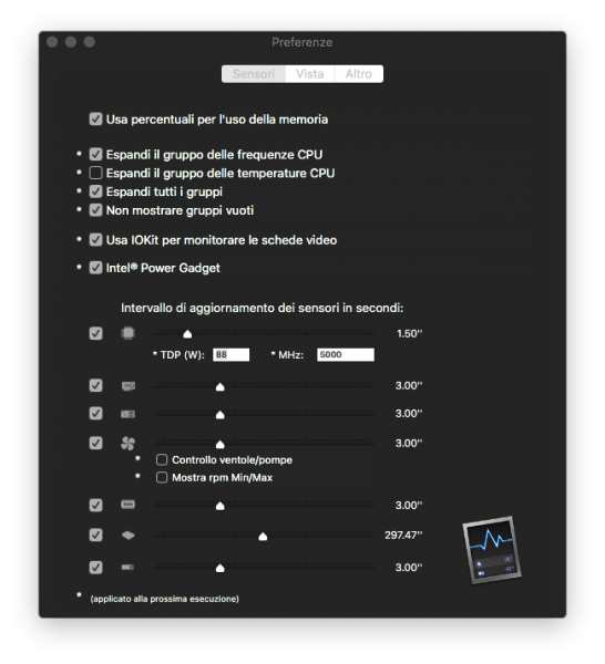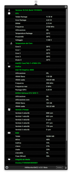 HWMonitorSMC2 è una ottima app per il monitoraggio di temperatura CPU, dischi, rotazioni ventole e in genere di tutto l'hardware a bordo dotato di sensori. HWMonitorSMC2 si avvale dei dati che gli vengono passati da qualsiasi kext, tipo FakeSMC/VirtualSMC, SMCProcessor, SMCSuperIO e da tutti i kext sensor reperibili dal sito dell'autore. Usa anche i valori passati dagli Intel Power gadget ✅ pagina di riferimento ✅ Download ✅ Release stable attuale: 2.6.1 ✳️ Procedura per uso: Si installa SWMonitorSMC2 Si tolgono FakeSMC e sensor di rehabman o FakeSMC + sensor di slice si inserisce VirtualSMC + SMCProcessor + SMCSuperIO https://github.com/acidanthera/VirtualSMC/releases si installano gli IPG https://www.macos86.it/topic/317-intel-power-gadget/?tab=comments#comment-5114 (no per AMD) e si attiva la lettura dati nelle preferenze di HWMonitorSMC2 si avranno dati più precisi anche con iStat, iStatistica, Sensei (questa funziona solo su catalina) Buona lettura dati