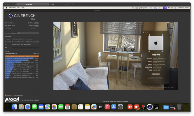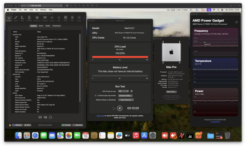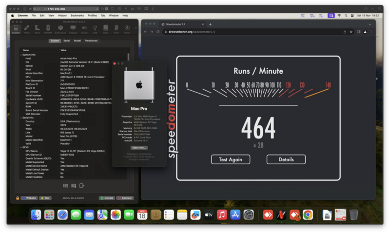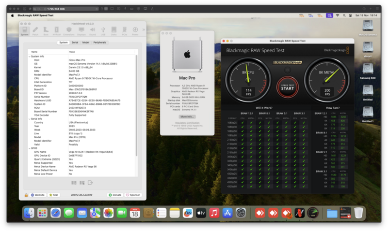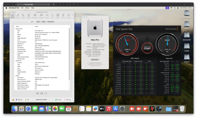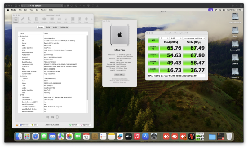 After a lot of work and a lot of help from @fabiosun and @Lorys89, the monster is finally ready! Thank you very much for your help! Asus ROG X670E Hero + AMD Ryzen 9 7950X + AMD Radeon RX VEGA 56 Component Versions macOS: Sonoma 14.1.1 Opencore: 0.9.6 AMD Kernel Patches: Latest from https://github.com/AMD-OSX/AMD_Vanilla BIOS: 1602 Some Notes Latest BIOS 1709 or higher, DSDT patch required, developed by @Lorys89 - Pls inject this DSDT.aml and set Enable/True RebaseRegions in config.plist This EFI is compatible with Intel Wireless and Bluetooth (onboard Wi-Fi 6e AX210) for macOS Ventura and Sonoma USBMap (corpnewt) method For BIOS newer or equal to v1709 Post reference Benchmarks - Speedometer v2.1 - Geekbench v5 & v6 https://browser.geekbench.com/v6/cpu/3609806 https://browser.geekbench.com/v5/cpu/21961976 - Dehancer Benchmark / Davinci - CPU Endurance for 10 minutes - Cinebench R23 - Cinebench 2024 (CPU & GPU) - Blackmagic RAW Speed Test - Blackmagic Disk Speed Test - Amorphous Memory Speed Test