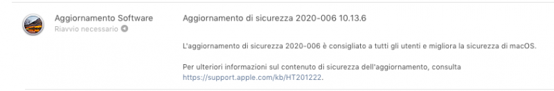 Nuovo security update per High Sierra https://support.apple.com/kb/DL2046?locale=en_US Download diretto: https://updates.cdn-apple.com/2020/macos/001-08573-20200714-0996400b-0c1a-4dc9-9510-274ba6163785/SecUpd2020-004HighSierra.dmg