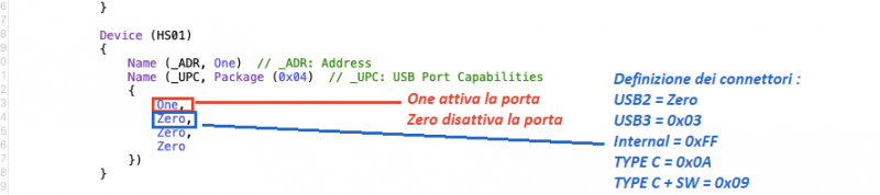 Ciao a tutti, oggi vi propongo un metodo di mappatura porte usb per i chipset intel serie 500 e 600 e 700. Piccola parentesi, si può usare pure su generazioni inferiori cambiando il percorso in ssdt come nella foto allegata sotto: cosa ci occorre : https://github.com/acidanthera/MaciASL/releases https://github.com/benbaker76/Hackintool/releases e questo ssdt : SSDT-XHC.aml.zip come potete vedere nella foto sotto, vi spiego come modificare ogni singola porta ma ricordate che da macos 11.3 si posson aver solo 15 porte massime attive. io nel ssdt sopra ho attivato le 14 hs e la ss01 per rientrare nel limite di 15 porte e iniziare la mappatura. la mobo in cui ho fatto la mappatura è una asrock b760m sonic wifi dove vi sono sul retro 2 porte usb2 (nel mio caso hs04 e hs03) ed in quelle ho messo tastiera e mouse usb. Prima di iniziare la mappatura nei vari step dovete cliccare su scopa e refresh all apertura di hackintool sezione usb dopo ogni riavvio poiché ogni volta che modificate ssdt per attivare o disattivare le porte occorre riavviare. guardando nella foto sotto ho mappato le porte usb2 come vedete hs11 è il led controller della mobo e consiglio di disattivare la porta sia nelle asrock che nelle asus ma nelle gigabyte lo dovrete lasciare attivo e mappare internal sennò perdete la funzione di risveglio da sleep. al secondo step ho disattivato tutte le porte hs tranne hs04 e hs03 essendo porte solo usb2 li ho lasciato mouse e tastiera e ho proseguito attivando le 10 porte ss e ho riavviato e iniziato a inserire dispositivi usb 3.x nelle porte ed ho ottenuto questo risultato infine ho contato le totali porte attive nelle 2 prove e tra hs e ss ho 14 porte totali e ho iniziato a disattivare quelle che non si sono illuminate e definire i connettori di quelle attive ed ho ottenuto questo risultato vi posto il mio ssdt con mappatura ultimata così potete capire meglio la procedura. (per iniziare dovete usare il primo ssdt postato sopra) SSDT-XHC.aml.zip Spero sia comprensibile e che vi aiuti a mappare le vostre porte usb e vi ringrazio per il tempo che avete dedicato alla lettura, per info e chiarimenti commentate pure sotto.