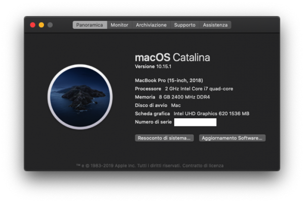 Piccolo notebook da 14 Pollici Geekbench score: https://browser.geekbench.com/v5/cpu/1361503 Cinebench R20 score: Specifiche: i7 8550u (4c 8t 4GHz) UHD620 8GB DDR4 256GB nvme Display FullHD IPS 14" Tastiera retroilluminata Scocca in alluminio >>---- 1° Test di installazione MacOS Catalina (aggiornato a 10.15.3) ----<< Bootloader: OpenCore Kexts: VirtualSMC + Plugins VoodooPS2Controller + Plugins Lilu Whatevergreen AppleALC RTL8111 Cosa funziona: Power Management Grafica Audio Rete Lan Batteria Tasti Fn Wifi Cosa non funziona (per ora): Regolazione luminosità (non si sa per quale arcano motivo)