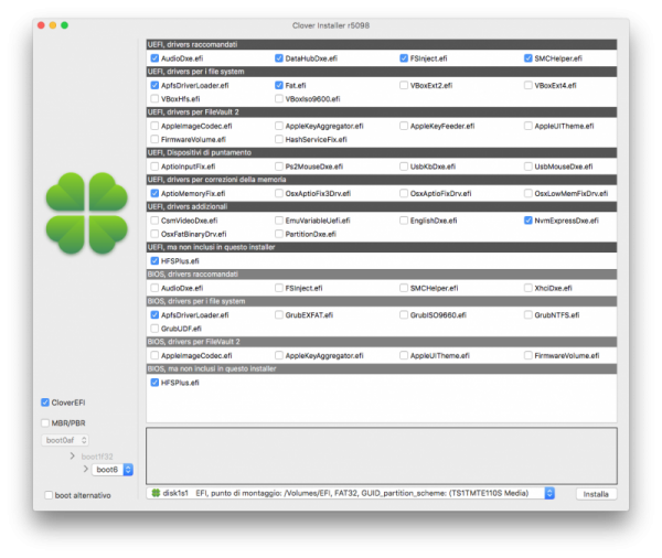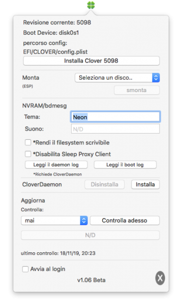 Ancora in beta ma credo che oramai siamo in dirittura d'arrivo per questa nuova app che comporta un nuovo modo di installare e gestire Clover. Una volta installata in applicazioni e mandata in esecuzione, la si ritroverà residente nella traybar, cliccandoci sopra si aprirà un menù con diverse opzioni, tra le quali la rilevazione della versione di Clover installata e se scaricato l'installer dovrebbe rilevare correttamente tutti i driver presenti in EFI ed aggiornare autonomamente solo quelli, perlomeno dal test da me effettuato tutto si è svolto regolarmente senza intoppi. Inoltre per hack senza NVRAM nativa, è possibile installare/rimuovere clover daemon che sono i sostituti degli rc.script per l'emulazione della NVRAM tramite il nvram.plist in EFI. Unica incognita da me non testata, se presenti gli rc.script li rimuove autonomamente o deve provvedere l'utente. Visto l'alto grado di automatismi, propendo per il fatto che li rimuova... vedremo prossimamente in qualche test. Opzioni possibili con Clover App Interfaccia installer con rilevamento automatico e selezione dei soli driver che trova presenti in EFI Installazione che provvede prima a creare sul desktop una copia di backup della EFI esistente per poi procedere all'installazione vera e propria 🤞Chi ha voglia di provare e lasciare le sue impressioni ✅ Thread dell'autore